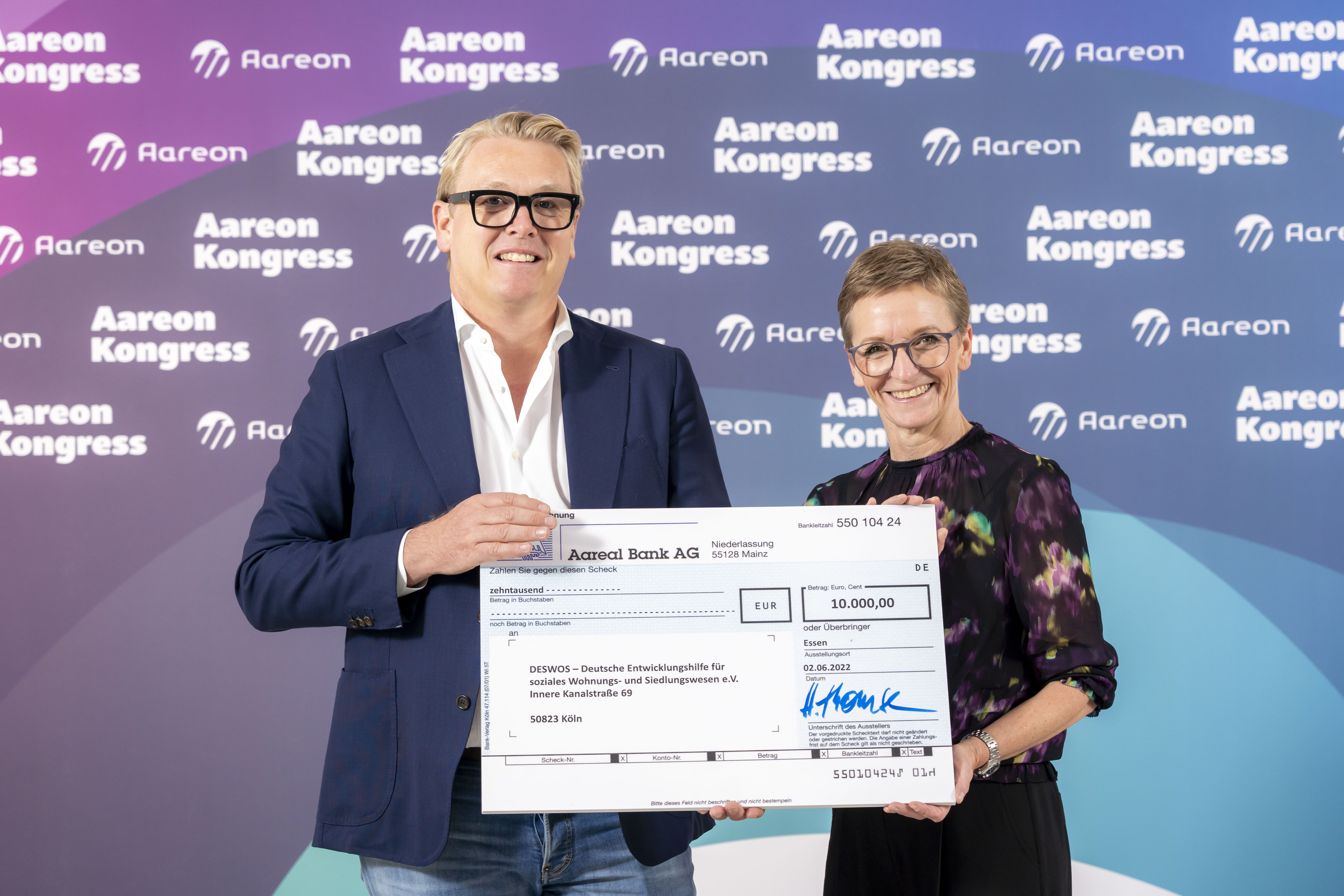 Essen, 3. Juni 2022 – Aareon, der führende Anbieter von ERP-Software und digitalen Lösungen für die europäische Immobilienwirtschaft und ihre Partner, spendet zum 17. Mal 10.000 Euro an die DESWOS – Deutsche Entwicklungshilfe für soziales Wohnungs- und Siedlungswesen e.V., Köln. Harry Thomson, Vorstandsvorsitzender der Aareon AG, überreichte den Spendenscheck im Rahmen des Feierabends auf dem Aareon Kongress an Petra Eggert-Höfel, Generalsekretärin der DESWOS.